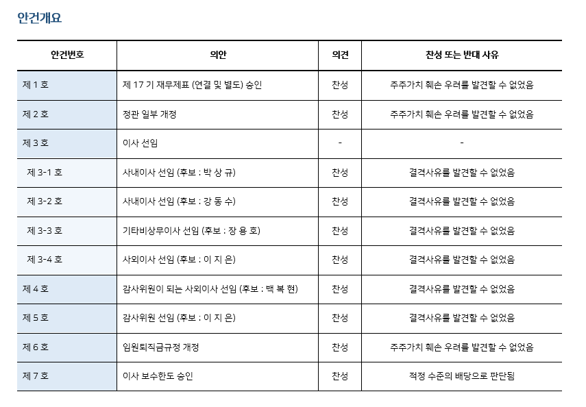 * 본 의안분석은 아주기업경영연구소의 의결권 행사 가이드라인에 따라 작성된 것이며, 세부 내용은 고객사에게만 제공됩니다.