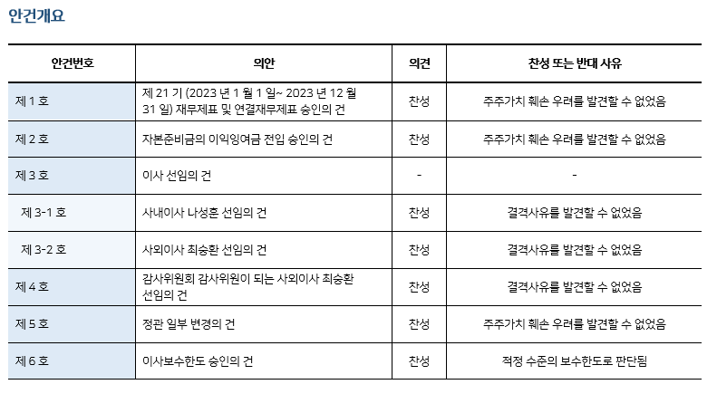* 본 의안분석은 아주기업경영연구소의 의결권 행사 가이드라인에 따라 작성된 것이며, 세부 내용은 고객사에게만 제공됩니다.