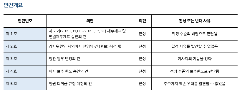 * 본 의안분석은 아주기업경영연구소의 의결권 행사 가이드라인에 따라 작성된 것이며, 세부 내용은 고객사에게만 제공됩니다.