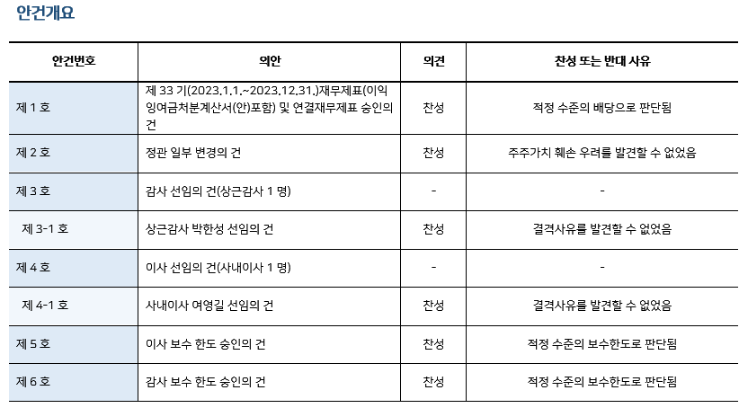* 본 의안분석은 아주기업경영연구소의 의결권 행사 가이드라인에 따라 작성된 것이며, 세부 내용은 고객사에게만 제공됩니다.