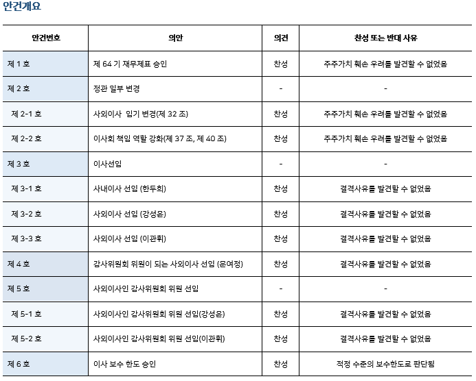 * 본 의안분석은 아주기업경영연구소의 의결권 행사 가이드라인에 따라 작성된 것이며, 세부 내용은 고객사에게만 제공됩니다.